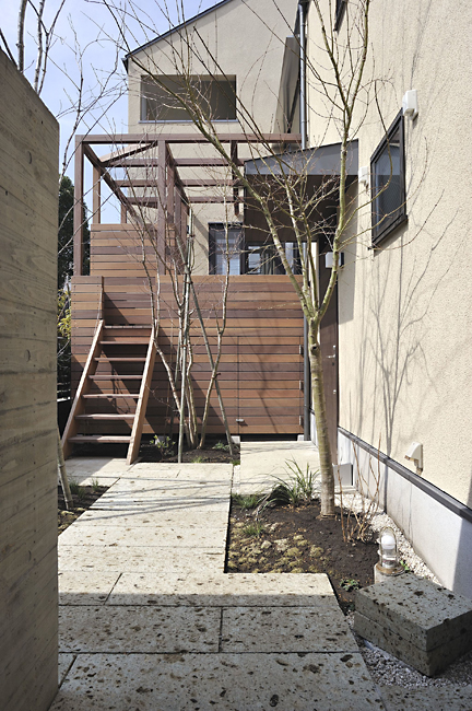 大谷石敷きの庭を抜ける玄関までのアプローチ。