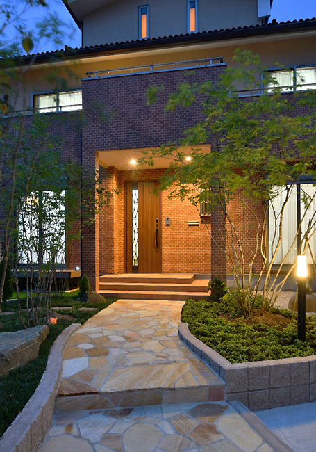 ライティングされたアプローチ・玄関ポーチは