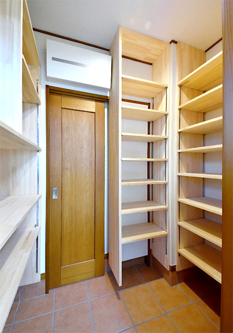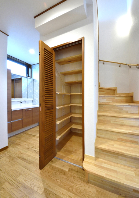 階段下収納の仕上げ材には桐板を使用し、湿気対策も万全です。