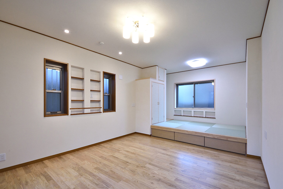 リビングには3帖のタタミコーナーを設け、くつろぎの小部屋と収納スペースを確保しました。