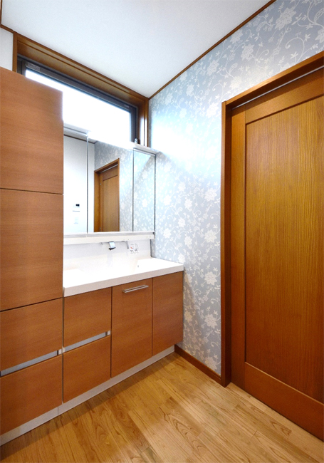 暗くなりがちな洗面室ですが、高所に横すべり出し窓を設置することで明るさを確保!換気も問題なく行えます。