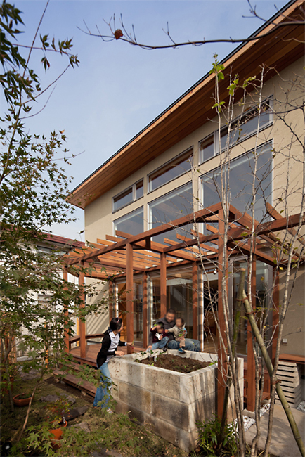 夏は軒やパーゴラなどを活かした日射遮蔽や高窓による排熱で日中も涼しい室内環境を実現している。