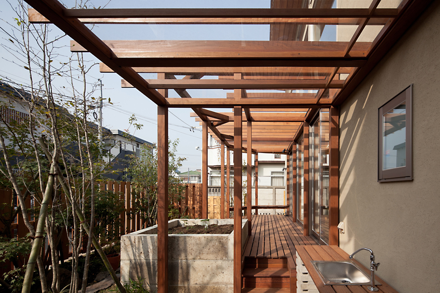 レイズドベッド(嵩上げ畑)とパーゴラを活かし、夏は緑のカーテンで覆われる。