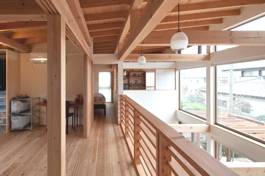 主寝室の一角に設けた3畳の書斎から、吹抜けを通しリビングまで視界がつながる。