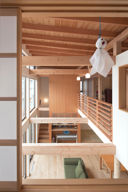 左側が12畳の子供室。建具を開いておくと、吹抜けを通して庭まで広々と空間がつながる。
