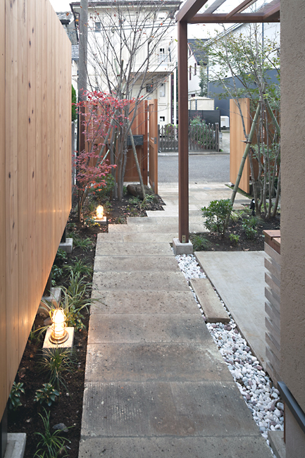 既存塀の大谷石を床に再利用した、道路から玄関へのアプローチ空間。